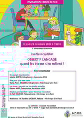 Le soir-même une conférence-débat était proposée sur le thème : "Objectif langage, quand les écrans s'en mêlent". Le public a répondu présent, puisque la salle était comble, avec environ une cinquantaine de personnes professionnelles de la petite enfance (médecin, pédiatre, pédospychaitre, orthophoniste, puéricultrice, infirmière, psychologue, étudiant)