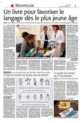 Vers 13h, nous avions rendez-vous avec une journaliste du Midi Libre ainsi que le photographe rattaché pour expliquer l'action de prévention contre l'illettrisme que nous menions. Après un long interview où deux orthophonistes se sont relayées pour répondre aux questions, nous sommes allées dans les chambres de la maternité pour offrir le fameux livre et le livret Objectif Langage. Les discussions avec les parents s'orientaient encore, comme très souvent, sur la place des écrans dans les interactions avec son enfant...